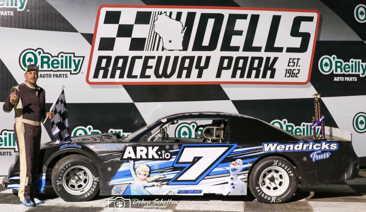 Wisconsin Dells WI 5/15/21-Joey Pontibriand from Norway Michigan made the 4hr trip to Dells Raceway Park a successful one as his picked up his first feature win at DRP in the Scenic RV Centers Sportsman division by holding off Chad Smith of Davis Junction IL for the Win. Dillon Sellner of Randolph MN came home a strong third with Henry Vian from Sparta fourth and current point leader David Borntreger of Wonewoc WI rounded out the top five. Earlier in the night Pontibrand won the Fast Dash as well and Tony Holm of Prior Lake MN won the Incredible Cars heat race. Brandon Birdsill of Reedsburg was the evenings fastest qualifier with a time of 14915 79.611mph