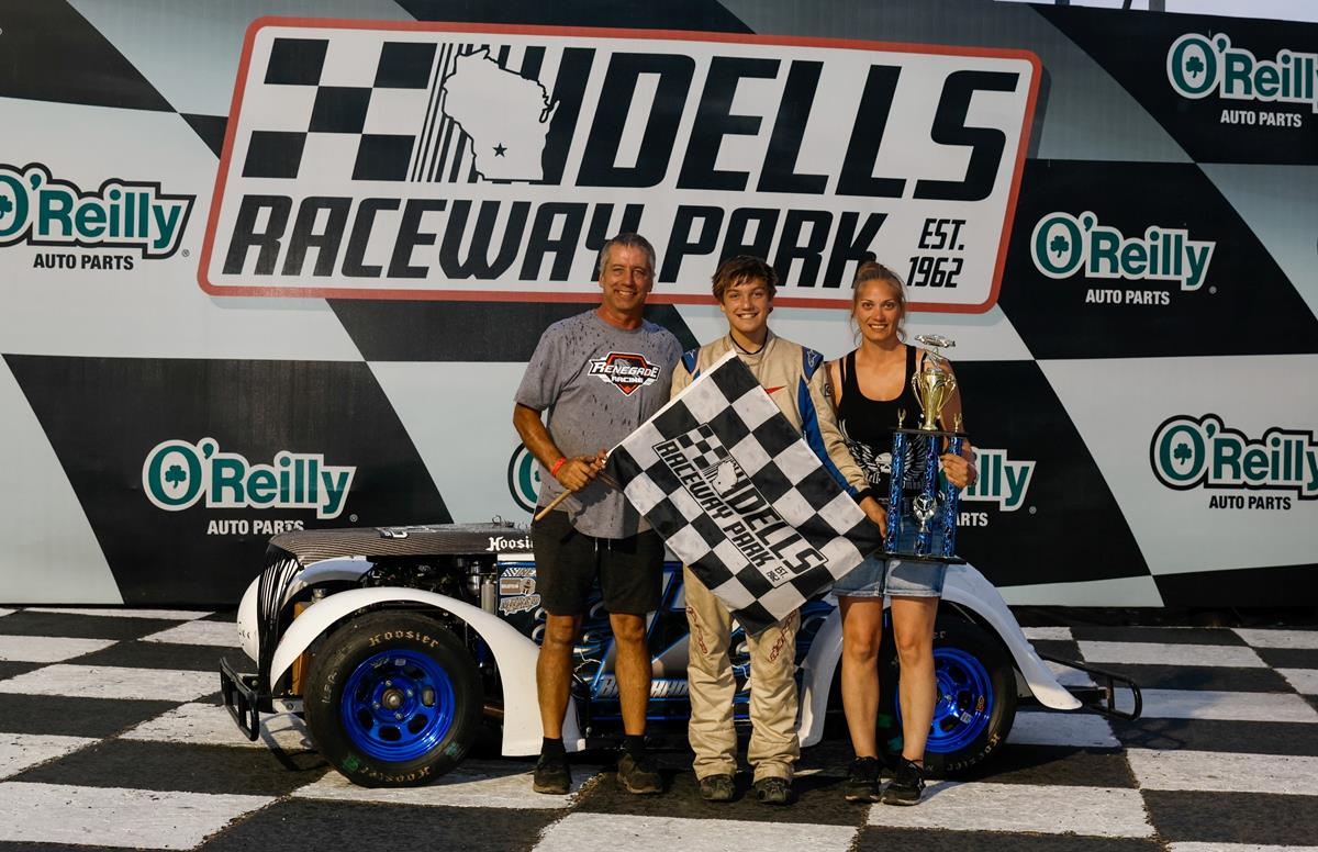 Wisconsin Dells WI-Ayrton Brockhouse outruns the field in the GNL INEX Legends A-Main at the Trickle 99 Presented by Lube USA. Ayden Brockhouse and Rose Borntreger brought a solid field of GNL INEX Legends to the stripe for the start. Rose Borntreger jumped out to the early lead as the field fanned out 2 and 3 wide in a race to the front. The 51 of Borntreger would lead for a handful of laps before Ayrton Brockhouse would burst onto the second spot from his 7th place starting position. It was obvious to see the younger of the Two Brockhouse boys was absolutely on it as he charged to an immediate and sizable lead. Jacob Tiegen would get in the mix as he fought through heavy traffic up to the second spot with laps falling by the wayside. Tiegen would set his sights on Brockhouse but Brockhouse was just too strong as the 7 of Tiegen was not able to gain on him. Ayrton Brockhouse was your winner followed by Jacob Tiegen, Tyler Ledbetter, Rose Borntreger and Mark Anderson Jr. Tiegen was fast qualifier with a lap of 15.524 he also won the Fast Dash. Adam “Flops” Hanson won the heat race. The GNL INEX Legends return to DRP July 15th as part of the Chasing Daylight Animal Shelter Night at the Races.