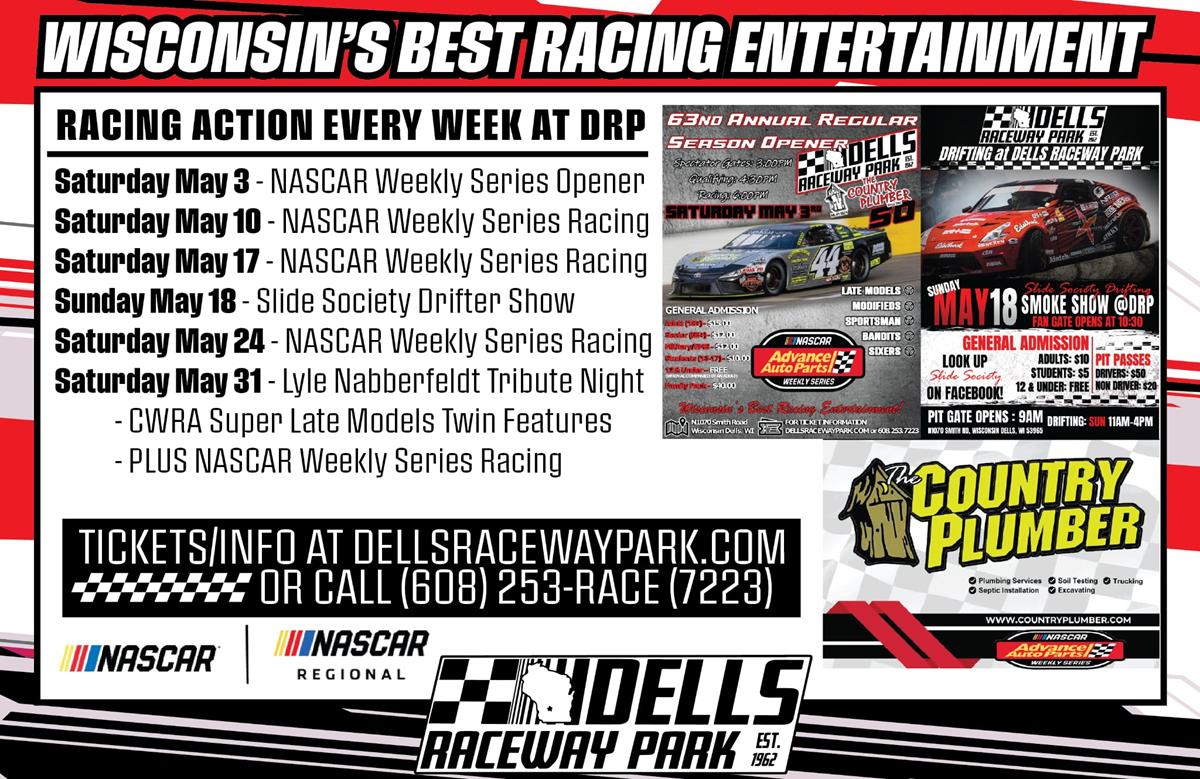 Wisconsin Dells WI-Plenty of Excitment coming up in the Month of May at Dells Raceway Park starting off May 3rd with the NASCAR Weekly Series featuring the Late Models in the Country Plumber 50 plus the Mods, Sportsman, Bandits, and Always Exciting Sixer Nation Street Stocks. Fan Gates open at 3pm with qualifying at 4:30 and Racing Action Starts at 6pm. General admission tickets can be purchased in advance to Skip the Lines and Save or at the track box office on the day of the event, Adults are just $15, Seniors, Military or First Responders $12, Students (13-17) $10, and Little Race Fans 12 & Under are always Free. Dells Raceway Park is located two miles west of I-90/94 at Exit 85 (Rocky Arbor) just off of Highway 12. Dells Raceway Park, "Wisconsin’s Best Racing Entertainment”