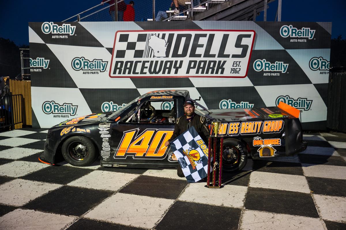 Wisconsin Dells WI-Allenton, W?isconsin's Aaron Moyer brought home the win in the Midwest Truck Series Jim Sauter Classic 50. Moyer would take the late race lead from Jordan DeVoy who led much of the early race. Moyer would utilize a masterful restart in the late going to pull away and collect his first career Midwest Truck Series Win. Following Moyer to the line was Jordan DeVoy, Grant Greisbach, Brandon Reichenberger and Eugene Gregorich III. The qualifying heats were won by Robbie Rucks and Tyler Noble while the odd/even heats were won by James Swan and Tyler Noble. Tom Steinbach won the Last Chance Race.